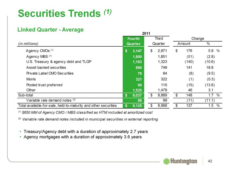 | Securities Trends (1) Linked Quarter - Average Treasury/Agency debt with a duration of approximately 2.7 yearsAgency mortgages with a duration of approximately 3.6 years 42 |