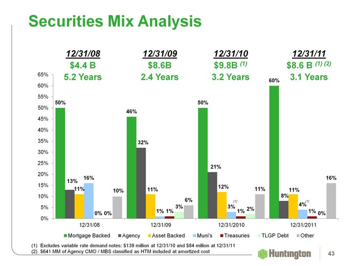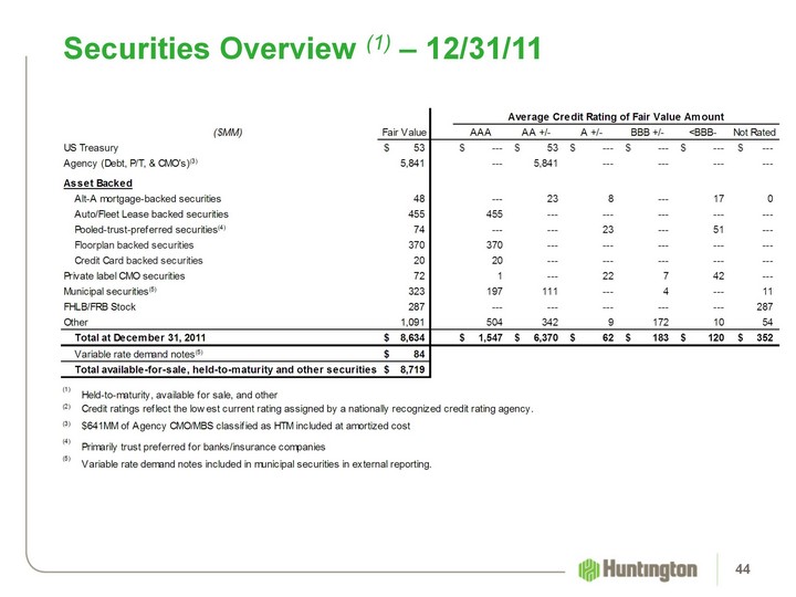 | (CHART) Securities Mix Analysis 12/31/10$9.8B (1)3.2 Years 12/31/08$4.4 B5.2 Years 12/31/09$8.6B2.4 Years Excludes variable rate demand notes: $139 million at 12/31/10 and $84 million at 12/31/11$641 MM of Agency CMO / MBS classified as HTM included at amortized cost (1) 12/31/11$8.6 B (1) (2)3.1 Years 43 (1) |