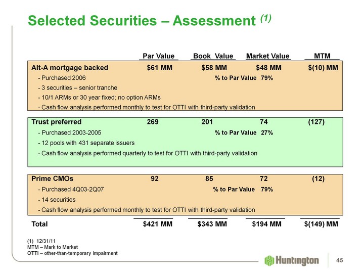 | Selected Securities - Assessment (1) Par Value Book Value Market Value MTMAlt-A mortgage backed $61 MM $58 MM $48 MM $(10) MM - Purchased 2006 % to Par Value 79% - 3 securities - senior tranche - 10/1 ARMs or 30 year fixed; no option ARMs - Cash flow analysis performed monthly to test for OTTI with third-party validationTrust preferred 269 201 74 (127) - Purchased 2003-2005 % to Par Value 27% - 12 pools with 431 separate issuers - Cash flow analysis performed quarterly to test for OTTI with third-party validationPrime CMOs 92 85 72 (12) - Purchased 4Q03-2Q07 % to Par Value 79% - 14 securities - Cash flow analysis performed monthly to test for OTTI with third-party validationTotal $421 MM $343 MM $194 MM $(149) MM 12/31/11MTM - Mark to MarketOTTI - other-than-temporary impairment 45 |