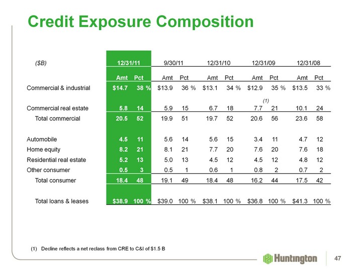 | ($B) 12/31/11 12/31/11 12/31/11 9/30/11 9/30/11 9/30/11 12/31/10 12/31/10 12/31/10 12/31/09 12/31/09 12/31/09 12/31/08 12/31/08 12/31/08 Amt Pct Amt Pct Amt Pct Amt Pct Amt Pct Commercial & industrial $14.7 38 % $13.9 36 % $13.1 34 % $12.9 35 % $13.5 33 % Commercial real estate 5.8 14 5.9 15 6.7 18 7.7 21 10.1 24 Total commercial 20.5 52 19.9 51 19.7 52 20.6 56 23.6 58 Automobile 4.5 11 5.6 14 5.6 15 3.4 11 4.7 12 Home equity 8.2 21 8.1 21 7.7 20 7.6 20 7.6 18 Residential real estate 5.2 13 5.0 13 4.5 12 4.5 12 4.8 12 Other consumer 0.5 3 0.5 1 0.6 1 0.8 2 0.7 2 Total consumer 18.4 48 19.1 49 18.4 48 16.2 44 17.5 42 Total loans & leases $38.9 100 % $39.0 100 % $38.1 100 % $36.8 100 % $41.3 100 % Credit Exposure Composition (1) Decline reflects a net reclass from CRE to C&I of $1.5 B (1) 47 |