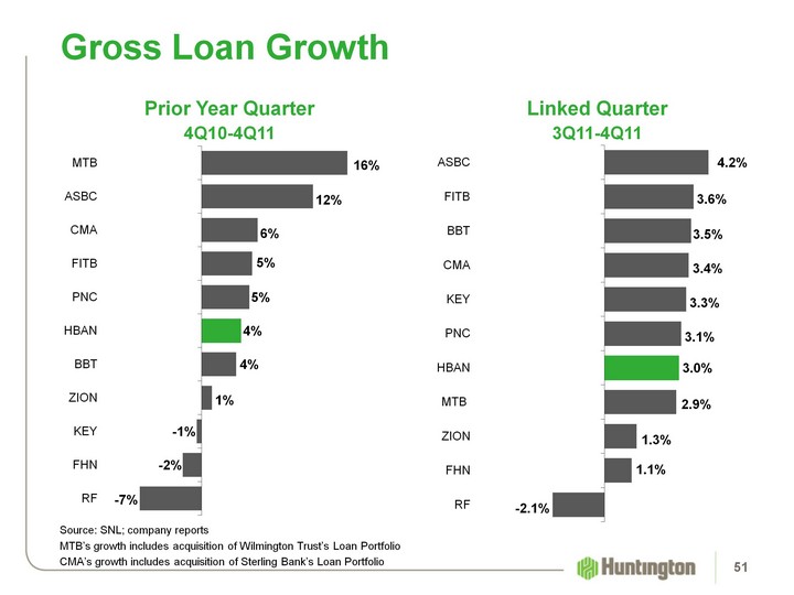 | Gross Loan Growth (CHART) (CHART) Source: SNL; company reportsMTB's growth includes acquisition of Wilmington Trust's Loan Portfolio CMA's growth includes acquisition of Sterling Bank's Loan Portfolio Prior Year Quarter4Q10-4Q11 Linked Quarter3Q11-4Q11 51 |