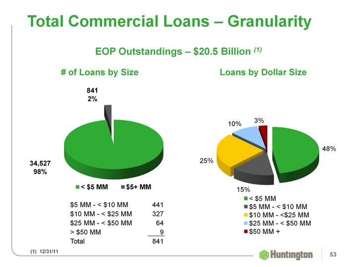 | (CHART) Total Commercial Loans - Granularity EOP Outstandings - $20.5 Billion (1) (CHART) 841 2% 34,52798% (1) 12/31/11 Loans by Dollar Size # of Loans by Size $5 MM - < $10 MM 441$10 MM - < $25 MM 327$25 MM - < $50 MM 64> $50 MM 9Total 841 53 |