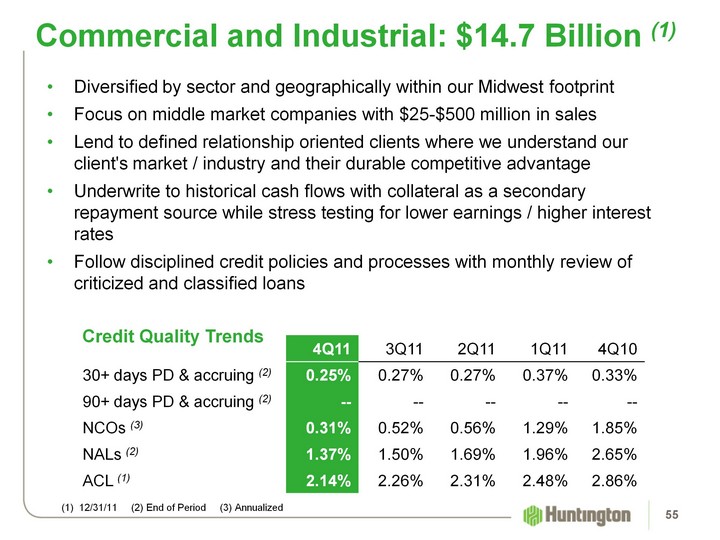 | Diversified by sector and geographically within our Midwest footprintFocus on middle market companies with $25-$500 million in salesLend to defined relationship oriented clients where we understand our client's market / industry and their durable competitive advantageUnderwrite to historical cash flows with collateral as a secondary repayment source while stress testing for lower earnings / higher interest ratesFollow disciplined credit policies and processes with monthly review of criticized and classified loans Credit Quality Trends Commercial and Industrial: $14.7 Billion (1) (1) 12/31/11 (2) End of Period (3) Annualized 4Q11 3Q11 2Q11 1Q11 4Q10 30+ days PD & accruing (2) 0.25% 0.27% 0.27% 0.37% 0.33% 90+ days PD & accruing (2) -- -- -- -- -- NCOs (3) 0.31% 0.52% 0.56% 1.29% 1.85% NALs (2) 1.37% 1.50% 1.69% 1.96% 2.65% ACL (1) 2.14% 2.26% 2.31% 2.48% 2.86% 55 |