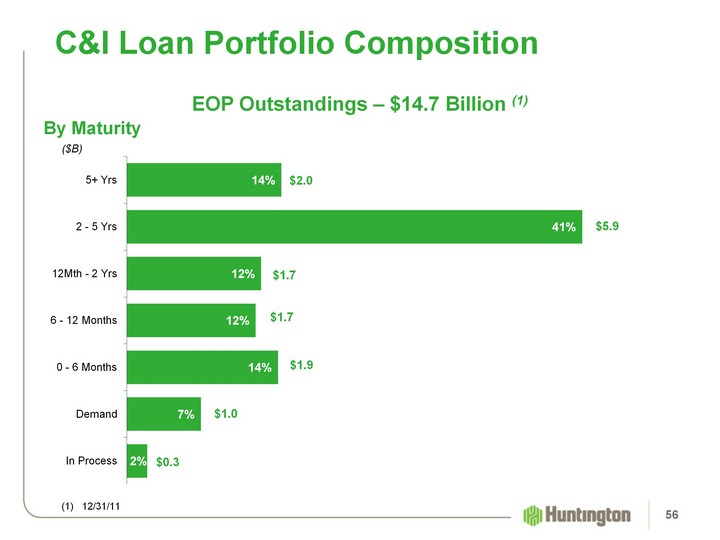 | (CHART) C&I Loan Portfolio Composition ($B) EOP Outstandings - $14.7 Billion (1) (1) 12/31/11 By Maturity $2.0 $5.9 $1.7 $1.7 $1.9 $1.0 $0.3 56 |
