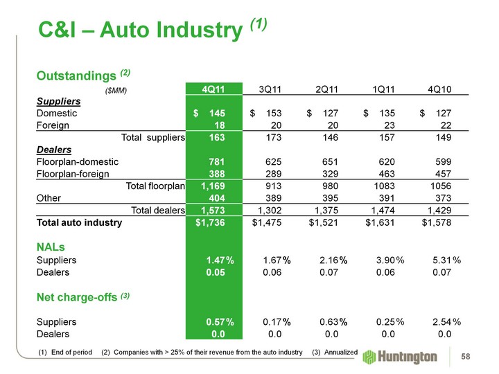 | C&I - Auto Industry (1) Outstandings (2) ($MM) 4Q11 3Q11 2Q11 1Q11 4Q10 Suppliers Domestic $ 145 $ 153 $ 127 $ 135 $ 127 Foreign 18 20 20 23 22 Total suppliers 163 173 146 157 149 Dealers Floorplan-domestic 781 625 651 620 599 Floorplan-foreign 388 289 329 463 457 Total floorplan 1,169 913 980 1083 1056 Other 404 389 395 391 373 Total dealers 1,573 1,302 1,375 1,474 1,429 Total auto industry $1,736 $1,475 $1,521 $1,631 $1,578 NALs Suppliers 1.47 % 1.67 % 2.16 % 3.90 % 5.31 % Dealers 0.05 0.06 0.07 0.06 0.07 Net charge-offs (3) Suppliers 0.57 % 0.17 % 0.63 % 0.25 %% 2.54 % Dealers 0.0 0.0 0.0 0.0 0.0 (1) End of period (2) Companies with > 25% of their revenue from the auto industry (3) Annualized 58 |