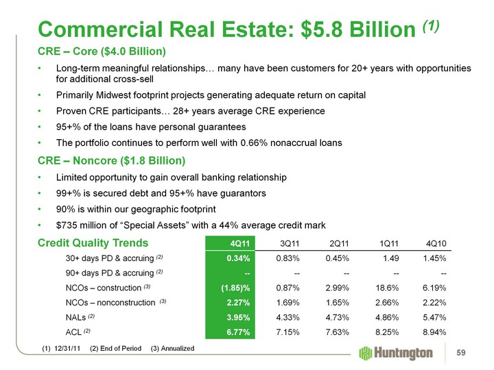 | Commercial Real Estate: $5.8 Billion (1) CRE - Core ($4.0 Billion)Long-term meaningful relationships... many have been customers for 20+ years with opportunities for additional cross-sellPrimarily Midwest footprint projects generating adequate return on capitalProven CRE participants... 28+ years average CRE experience95+% of the loans have personal guaranteesThe portfolio continues to perform well with 0.66% nonaccrual loansCRE - Noncore ($1.8 Billion)Limited opportunity to gain overall banking relationship99+% is secured debt and 95+% have guarantors90% is within our geographic footprint$735 million of "Special Assets" with a 44% average credit markCredit Quality Trends 4Q11 3Q11 2Q11 1Q11 4Q10 30+ days PD & accruing (2) 0.34% 0.83% 0.45% 1.49 1.45% 90+ days PD & accruing (2) -- -- -- -- -- NCOs - construction (3) (1.85)% 0.87% 2.99% 18.6% 6.19% NCOs - nonconstruction (3) 2.27% 1.69% 1.65% 2.66% 2.22% NALs (2) 3.95% 4.33% 4.73% 4.86% 5.47% ACL (2) 6.77% 7.15% 7.63% 8.25% 8.94% 59 (1) 12/31/11 (2) End of Period (3) Annualized |