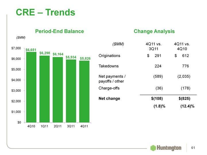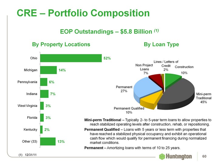 | (CHART) CRE - Portfolio Composition Permanent 27% Mini-perm Traditional45% Construction 10% Non Project Loans 7% (CHART) Lines / Letters of Credit2% (1) 12/31/11 Permanent Qualified10% Mini-perm Traditional - Typically 2- to 5-year term loans to allow properties to reach stabilized operating levels after construction, rehab, or repositioning.Permanent Qualified - Loans with 5 years or less term with properties that have reached a stabilized physical occupancy and exhibit an operational cash flow which would qualify for permanent financing during normalized market conditions.Permanent - Amortizing loans with terms of 10 to 25 years. EOP Outstandings - $5.8 Billion (1) By Loan Type By Property Locations 60 |