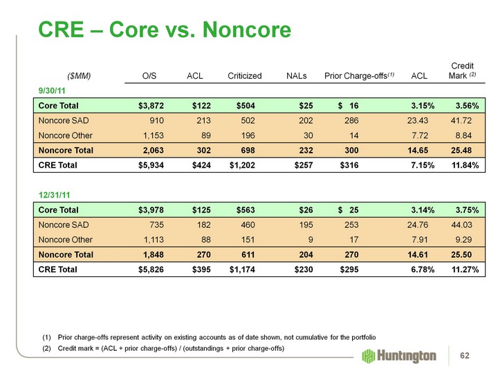 | CRE - Core vs. Noncore ($MM) O/S ACL Criticized NALs Prior Charge-offs(1) ACL Credit Mark (2) 9/30/11 Core Total $3,872 $122 $504 $25 $ 16 3.15% 3.56% Noncore SAD 910 213 502 202 286 23.43 41.72 Noncore Other 1,153 89 196 30 14 7.72 8.84 Noncore Total 2,063 302 698 232 300 14.65 25.48 CRE Total $5,934 $424 $1,202 $257 $316 7.15% 11.84% 12/31/11 Core Total $3,978 $125 $563 $26 $ 25 3.14% 3.75% Noncore SAD 735 182 460 195 253 24.76 44.03 Noncore Other 1,113 88 151 9 17 7.91 9.29 Noncore Total 1,848 270 611 204 270 14.61 25.50 CRE Total $5,826 $395 $1,174 $230 $295 6.78% 11.27% (1) Prior charge-offs represent activity on existing accounts as of date shown, not cumulative for the portfolio(2) Credit mark = (ACL + prior charge-offs) / (outstandings + prior charge-offs) 62 |