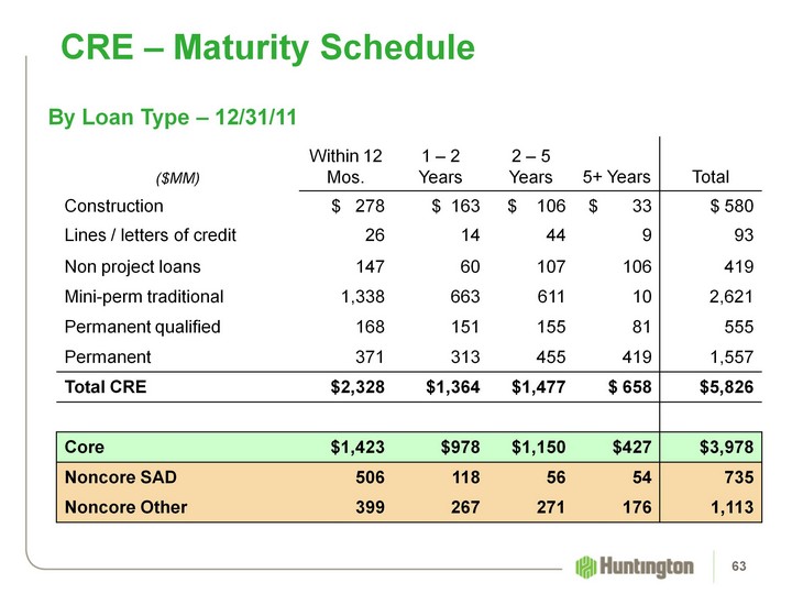 | CRE - Maturity Schedule By Loan Type - 12/31/11 ($MM) Within 12 Mos. 1 - 2 Years 2 - 5 Years 5+ Years Total Construction $ 278 $ 163 $ 106 $ 33 $ 580 Lines / letters of credit 26 14 44 9 93 Non project loans 147 60 107 106 419 Mini-perm traditional 1,338 663 611 10 2,621 Permanent qualified 168 151 155 81 555 Permanent 371 313 455 419 1,557 Total CRE $2,328 $1,364 $1,477 $ 658 $5,826 Core $1,423 $978 $1,150 $427 $3,978 Noncore SAD 506 118 56 54 735 Noncore Other 399 267 271 176 1,113 63 |