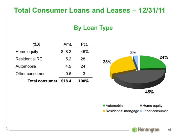 | Total Consumer Loans and Leases - 12/31/11 ($B) Amt. Pct. Home equity $ 8.2 45% Residential RE 5.2 28 Automobile 4.5 24 Other consumer 0.5 3 Total consumer $18.4 100% (CHART) By Loan Type 65 |