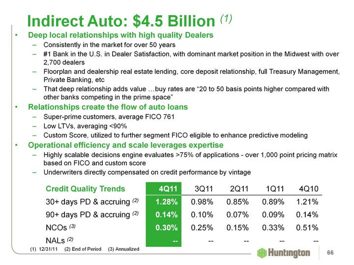 | Deep local relationships with high quality DealersConsistently in the market for over 50 years#1 Bank in the U.S. in Dealer Satisfaction, with dominant market position in the Midwest with over 2,700 dealersFloorplan and dealership real estate lending, core deposit relationship, full Treasury Management, Private Banking, etcThat deep relationship adds value ...buy rates are "20 to 50 basis points higher compared with other banks competing in the prime space"Relationships create the flow of auto loansSuper-prime customers, average FICO 761Low LTVs, averaging <90%Custom Score, utilized to further segment FICO eligible to enhance predictive modelingOperational efficiency and scale leverages expertiseHighly scalable decisions engine evaluates >75% of applications - over 1,000 point pricing matrix based on FICO and custom scoreUnderwriters directly compensated on credit performance by vintage Indirect Auto: $4.5 Billion (1) Credit Quality Trends 4Q11 3Q11 2Q11 1Q11 4Q10 30+ days PD & accruing (2) 1.28% 0.98% 0.85% 0.89% 1.21% 90+ days PD & accruing (2) 0.14% 0.10% 0.07% 0.09% 0.14% NCOs (3) 0.30% 0.25% 0.15% 0.33% 0.51% NALs (2) -- -- -- -- -- 66 (1) 12/31/11 (2) End of Period (3) Annualized |
