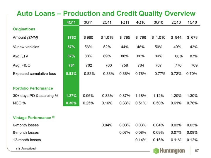 | Auto Loans - Production and Credit Quality Overview Auto Loans - Production and Credit Quality Overview (1) Annualized 67 |