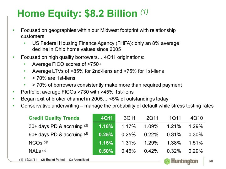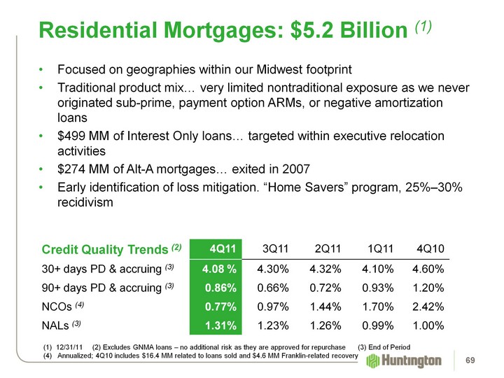 | Home Equity: $8.2 Billion (1) Focused on geographies within our Midwest footprint with relationship customersUS Federal Housing Finance Agency (FHFA): only an 8% average decline in Ohio home values since 2005 Credit Quality Trends 4Q11 3Q11 2Q11 1Q11 4Q10 30+ days PD & accruing (2) 1.18% 1.17% 1.09% 1.21% 1.29% 90+ days PD & accruing (2) 0.25% 0.25% 0.22% 0.31% 0.30% NCOs (3) 1.15% 1.31% 1.29% 1.38% 1.51% NALs (2) 0.50% 0.46% 0.42% 0.32% 0.29% 68 (1) 12/31/11 (2) End of Period (3) Annualized Focused on high quality borrowers... 4Q11 originations:Average FICO scores of >750+ Average LTVs of <85% for 2nd-liens and <75% for 1st-liens> 70% are 1st-liens> 70% of borrowers consistently make more than required paymentPortfolio: average FICOs >730 with >45% 1st-liensBegan exit of broker channel in 2005... <5% of outstandings todayConservative underwriting - manage the probability of default while stress testing rates |
