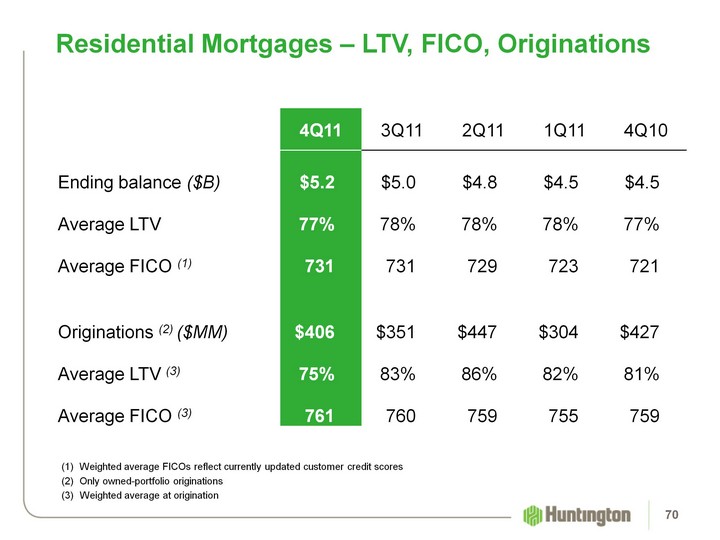 | Residential Mortgages - LTV, FICO, Originations (1) Weighted average FICOs reflect currently updated customer credit scores(2) Only owned-portfolio originationsWeighted average at origination 4Q11 3Q11 2Q11 1Q11 4Q10 Ending balance ($B) $5.2 $5.0 $4.8 $4.5 $4.5 Average LTV 77% 78% 78% 78% 77% Average FICO (1) 731 731 729 723 721 Originations (2) ($MM) $406 $351 $447 $304 $427 Average LTV (3) 75% 83% 86% 82% 81% Average FICO (3) 761 760 759 755 759 70 |