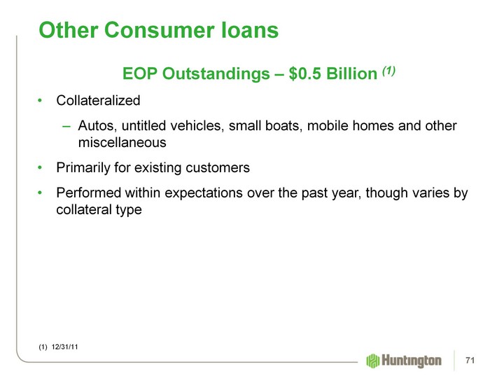 | Other Consumer loans EOP Outstandings - $0.5 Billion (1)CollateralizedAutos, untitled vehicles, small boats, mobile homes and other miscellaneousPrimarily for existing customersPerformed within expectations over the past year, though varies by collateral type (1) 12/31/11 71 |