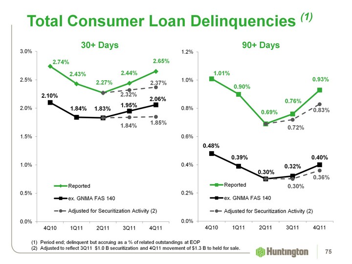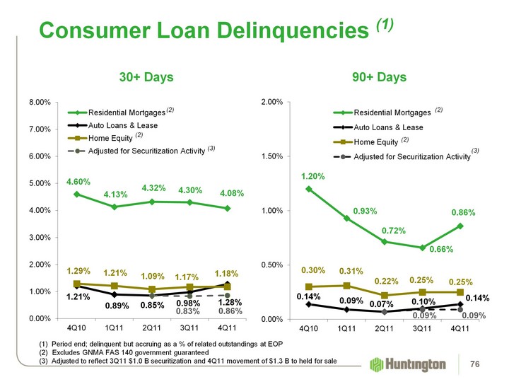 | Consumer Loan Delinquencies (1) (CHART) (1) Period end; delinquent but accruing as a % of related outstandings at EOPExcludes GNMA FAS 140 government guaranteed(3) Adjusted to reflect 3Q11 $1.0 B securitization and 4Q11 movement of $1.3 B to held for sale (CHART) (2) (2) (2) (2) 90+ Days 30+ Days 76 (3) (3) |