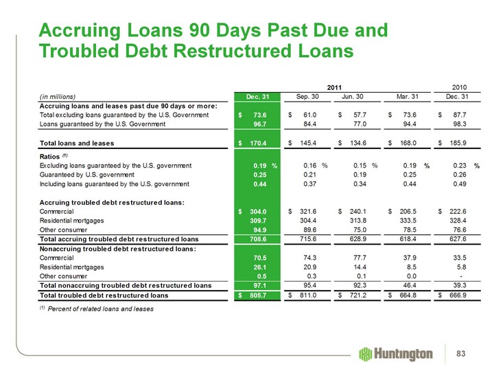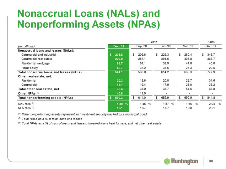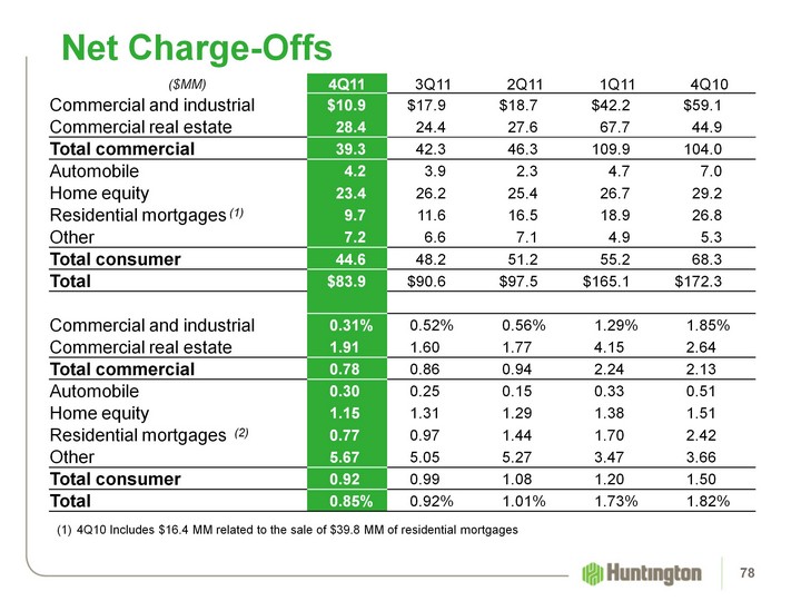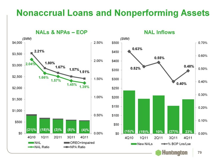 | Net Charge-Offs ($MM) 4Q11 3Q11 2Q11 1Q11 4Q10 Commercial and industrial $10.9 $17.9 $18.7 $42.2 $59.1 Commercial real estate 28.4 24.4 27.6 67.7 44.9 Total commercial 39.3 42.3 46.3 109.9 104.0 Automobile 4.2 3.9 2.3 4.7 7.0 Home equity 23.4 26.2 25.4 26.7 29.2 Residential mortgages (1) 9.7 11.6 16.5 18.9 26.8 Other 7.2 6.6 7.1 4.9 5.3 Total consumer 44.6 48.2 51.2 55.2 68.3 Total $83.9 $90.6 $97.5 $165.1 $172.3 Commercial and industrial 0.31% 0.52% 0.56% 1.29% 1.85% Commercial real estate 1.91 1.60 1.77 4.15 2.64 Total commercial 0.78 0.86 0.94 2.24 2.13 Automobile 0.30 0.25 0.15 0.33 0.51 Home equity 1.15 1.31 1.29 1.38 1.51 Residential mortgages (2) 0.77 0.97 1.44 1.70 2.42 Other 5.67 5.05 5.27 3.47 3.66 Total consumer 0.92 0.99 1.08 1.20 1.50 Total 0.85% 0.92% 1.01% 1.73% 1.82% 4Q10 Includes $16.4 MM related to the sale of $39.8 MM of residential mortgages 78 |