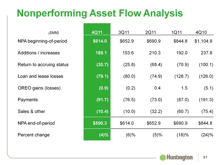 | ($MM) 4Q11 3Q11 2Q11 1Q11 4Q10 NPA beginning-of-period $614.0 $652.9 $690.9 $844.8 $1,104.9 Additions / increases 189.1 153.6 210.3 192.0 237.8 Return to accruing status (30.7) (25.8) (68.4) (70.9) (100.1) Loan and lease losses (79.1) (80.0) (74.9) (128.7) (126.0) OREO gains (losses) (0.9) (0.2) 0.4 1.5 (5.1) Payments (91.7) (76.5) (73.0) (87.0) (191.3) Sales & other (10.4) (10.0) (32.2) (60.7) (75.4) NPA end-of-period $590.3 $614.0 $652.9 $690.9 $844.8 Percent change (4)% (6)% (5)% (18)% (24)% Nonperforming Asset Flow Analysis 81 |