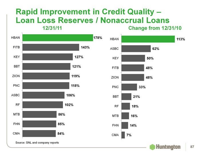 | Rapid Improvement in Credit Quality - Loan Loss Reserves / Nonaccrual Loans (CHART) (CHART) Source: SNL and company reports 12/31/11 Change from 12/31/10 87 |
