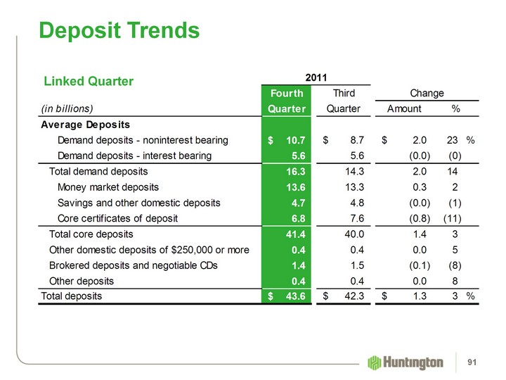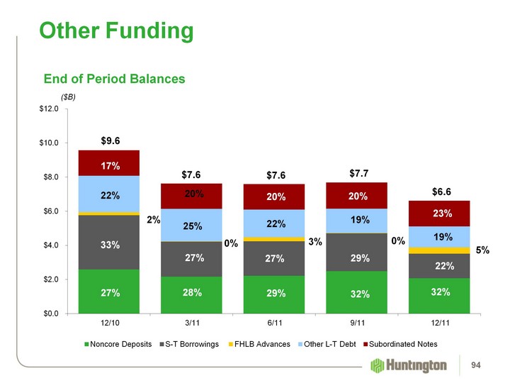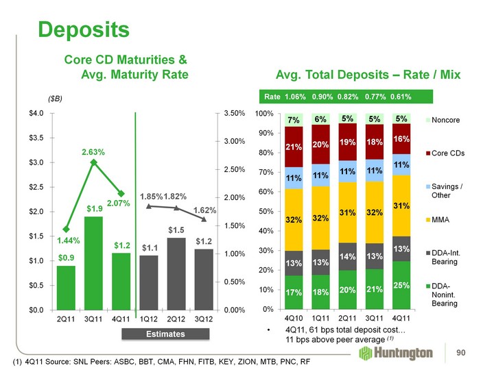 | (CHART) (CHART) Deposits ($B) Avg. Total Deposits - Rate / Mix Core CD Maturities & Avg. Maturity Rate Rate 1.06% 0.90% 0.82% 0.77% 0.61% Estimates 90 4Q11, 61 bps total deposit cost... 11 bps above peer average (1) 4Q11 Source: SNL Peers: ASBC, BBT, CMA, FHN, FITB, KEY, ZION, MTB, PNC, RF |