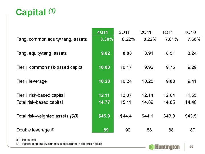 | 4Q11 3Q11 2Q11 1Q11 4Q10 Tang. common equity/ tang. assets 8.30% 8.22% 8.22% 7.81% 7.56% Tang. equity/tang. assets 9.02 8.88 8.91 8.51 8.24 Tier 1 common risk-based capital 10.00 10.17 9.92 9.75 9.29 Tier 1 leverage 10.28 10.24 10.25 9.80 9.41 Tier 1 risk-based capital 12.11 12.37 12.14 12.04 11.55 Total risk-based capital 14.77 15.11 14.89 14.85 14.46 Total risk-weighted assets ($B) $45.9 $44.4 $44.1 $43.0 $43.5 Double leverage (2) 89 90 88 88 87 Capital (1) (1) Period end (2) (Parent company investments in subsidiaries + goodwill) / equity 96 |