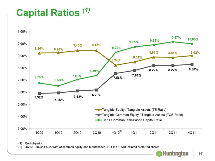 | (CHART) Capital Ratios (1) End-of-period4Q10 - Raised $920 MM of common equity and repurchased $1.4 B of TARP related preferred shares (2) 97 |