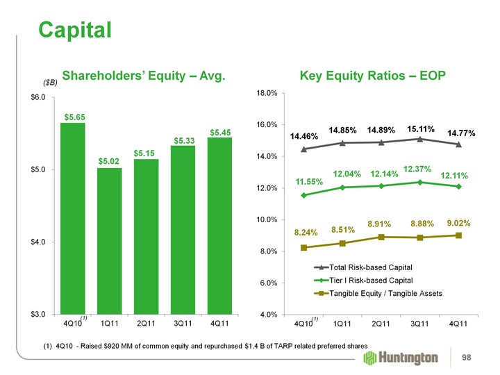 | (CHART) Shareholders' Equity - Avg. (CHART) Capital Key Equity Ratios - EOP ($B) 98 4Q10 - Raised $920 MM of common equity and repurchased $1.4 B of TARP related preferred shares |