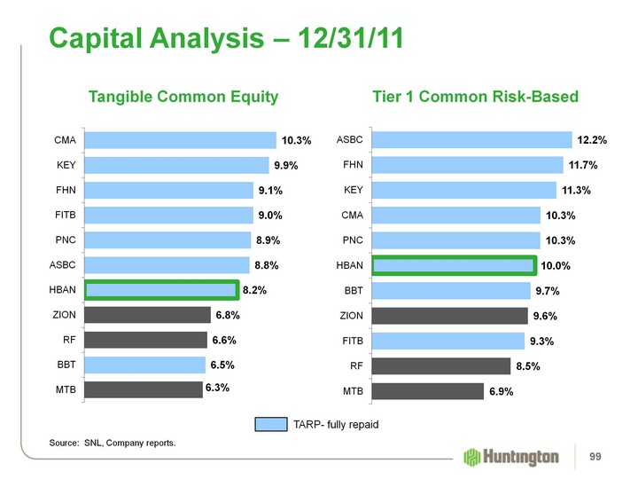 | (CHART) Capital Analysis - 12/31/11 (CHART) Source: SNL, Company reports. Tier 1 Common Risk-Based Tangible Common Equity TARP- fully repaid 99 |