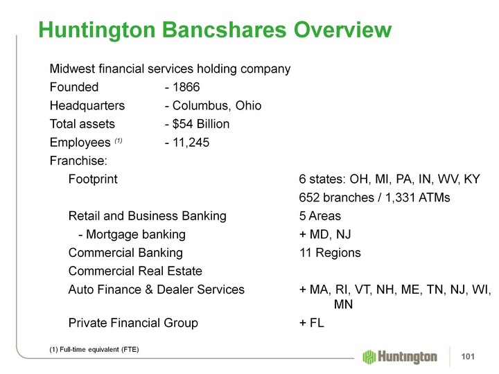 | Huntington Bancshares Overview Midwest financial services holding companyFounded - 1866Headquarters - Columbus, OhioTotal assets - $54 Billion Employees (1) - 11,245Franchise: Footprint 6 states: OH, MI, PA, IN, WV, KY 652 branches / 1,331 ATMs Retail and Business Banking 5 Areas - Mortgage banking + MD, NJ Commercial Banking 11 Regions Commercial Real Estate Auto Finance & Dealer Services + MA, RI, VT, NH, ME, TN, NJ, WI, MN Private Financial Group + FL (1) Full-time equivalent (FTE) 101 |