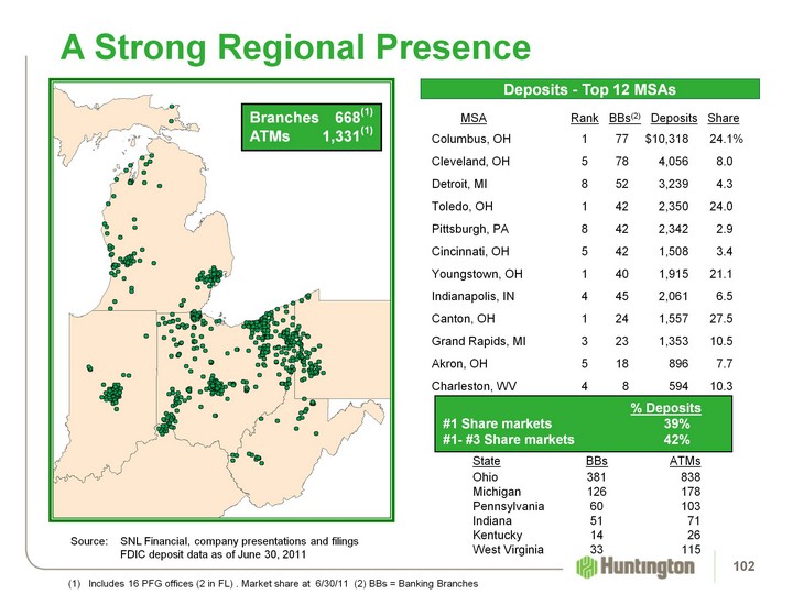 | A Strong Regional Presence Source: SNL Financial, company presentations and filings FDIC deposit data as of June 30, 2011 Deposits - Top 12 MSAs MSA Rank BBs(2) Deposits ShareColumbus, OH 1 77 $10,318 24.1%Cleveland, OH 5 78 4,056 8.0Detroit, MI 8 52 3,239 4.3Toledo, OH 1 42 2,350 24.0Pittsburgh, PA 8 42 2,342 2.9Cincinnati, OH 5 42 1,508 3.4Youngstown, OH 1 40 1,915 21.1Indianapolis, IN 4 45 2,061 6.5Canton, OH 1 24 1,557 27.5Grand Rapids, MI 3 23 1,353 10.5Akron, OH 5 18 896 7.7Charleston, WV 4 8 594 10.3 % Deposits#1 Share markets 39% #1- #3 Share markets 42% 102 Includes 16 PFG offices (2 in FL) . Market share at 6/30/11 (2) BBs = Banking Branches Branches 668(1)ATMs 1,331(1) State BBs ATMs Ohio 381 838 Michigan 126 178 Pennsylvania 60 103 Indiana 51 71 Kentucky 14 26 West Virginia 33 115 |