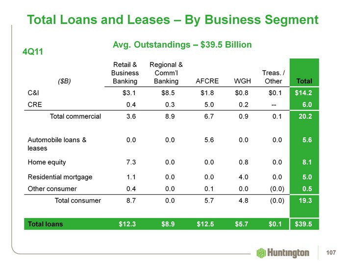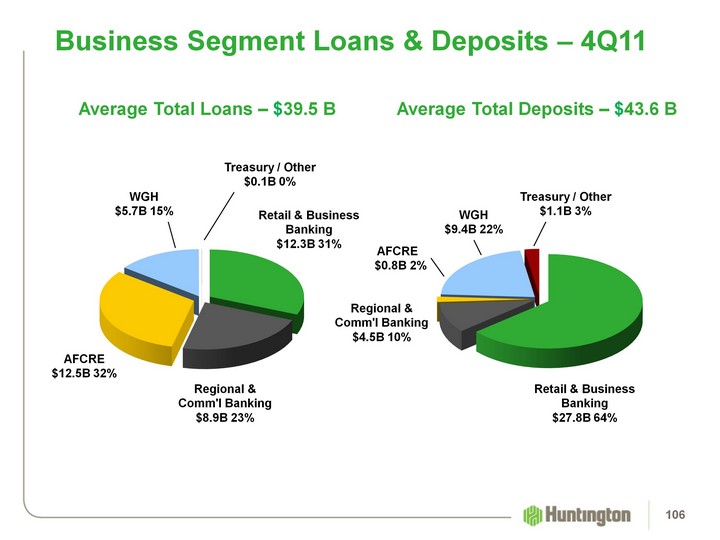 | Business Segment Loans & Deposits - 4Q11 Average Total Deposits - $43.6 B Average Total Loans - $39.5 B (CHART) (CHART) AFCRE $12.5B 32% Retail & Business Banking $12.3B 31% Treasury / Other $0.1B 0% Regional & Comm'l Banking $8.9B 23% WGH $5.7B 15% AFCRE $0.8B 2% Treasury / Other $1.1B 3% Retail & Business Banking $27.8B 64% Regional & Comm'l Banking $4.5B 10% WGH $9.4B 22% 106 |
