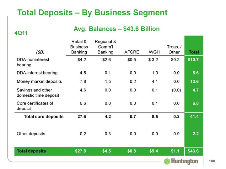 | Total Deposits - By Business Segment Total Deposits - By Business Segment Avg. Balances - $43.6 Billion 4Q11 108 |