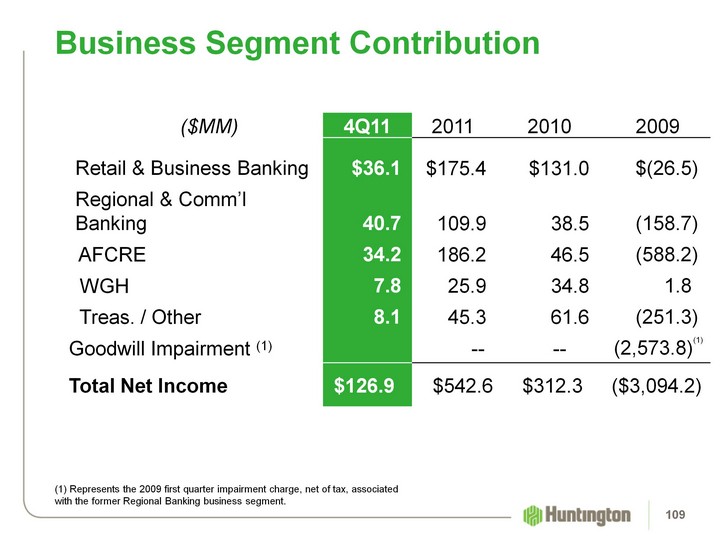 | Business Segment Contribution ($MM) 4Q11 2011 2010 2009 Retail & Business Banking $36.1 $175.4 $131.0 $(26.5) Regional & Comm'l Banking 40.7 109.9 38.5 (158.7) AFCRE 34.2 186.2 46.5 (588.2) WGH 7.8 25.9 34.8 1.8 Treas. / Other 8.1 45.3 61.6 (251.3) Goodwill Impairment (1) -- -- (2,573.8)(1) Total Net Income $126.9 $542.6 $312.3 ($3,094.2) (1) Represents the 2009 first quarter impairment charge, net of tax, associated with the former Regional Banking business segment. 109 |