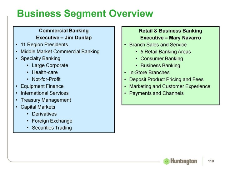 | Business Segment Overview Commercial BankingExecutive - Jim Dunlap11 Region PresidentsMiddle Market Commercial BankingSpecialty BankingLarge CorporateHealth-careNot-for-ProfitEquipment FinanceInternational ServicesTreasury ManagementCapital MarketsDerivativesForeign ExchangeSecurities Trading Retail & Business BankingExecutive - Mary NavarroBranch Sales and Service5 Retail Banking AreasConsumer BankingBusiness BankingIn-Store BranchesDeposit Product Pricing and FeesMarketing and Customer ExperiencePayments and Channels 110 |