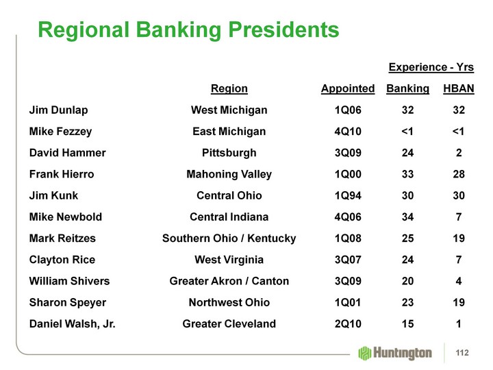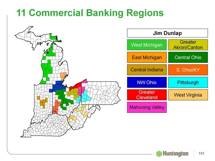 | 11 Commercial Banking Regions GreaterAkron/Canton Mahoning Valley Central Ohio NW Ohio S. Ohio/KY GreaterCleveland Central Indiana West Michigan East Michigan West Virginia Pittsburgh Jim Dunlap 111 |
