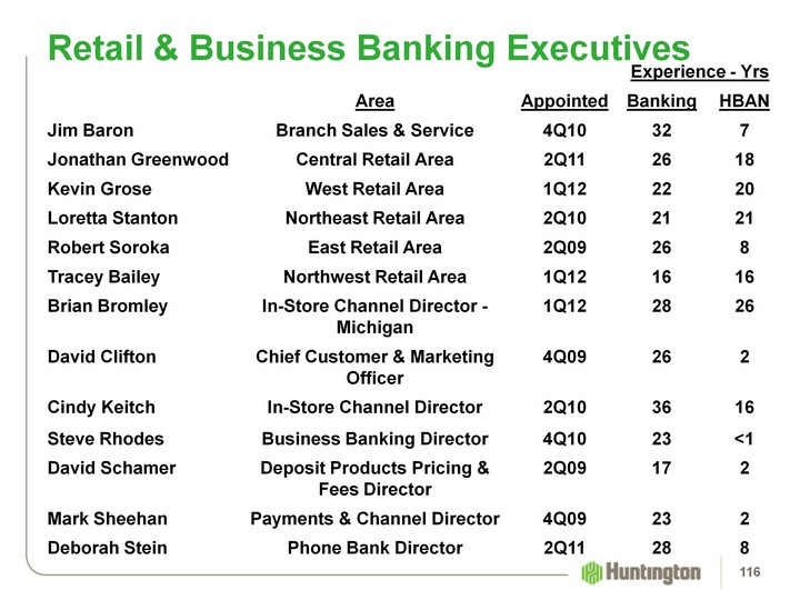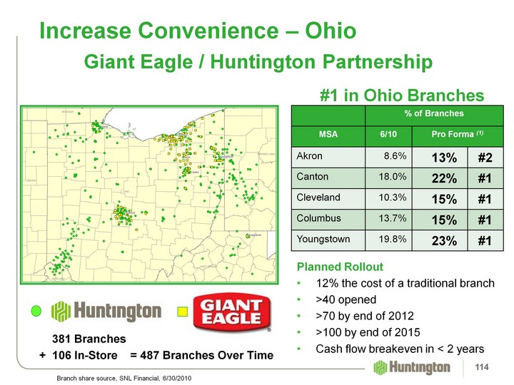 | #1 in Ohio BranchesPlanned Rollout12% the cost of a traditional branch>40 opened>70 by end of 2012>100 by end of 2015Cash flow breakeven in < 2 years Increase Convenience - Ohio Branch share source, SNL Financial, 6/30/2010 % of Branches % of Branches % of Branches MSA 6/10 Pro Forma (1) Pro Forma (1) Akron 8.6% 13% #2 Canton 18.0% 22% #1 Cleveland 10.3% 15% #1 Columbus 13.7% 15% #1 Youngstown 19.8% 23% #1 381 Branches + 106 In-Store = 487 Branches Over Time Giant Eagle / Huntington Partnership 114 114 |