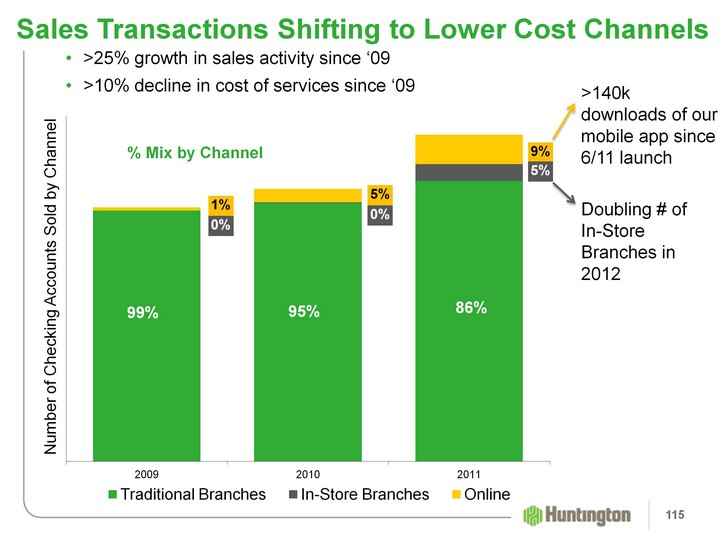 | Sales Transactions Shifting to Lower Cost Channels >25% growth in sales activity since '09>10% decline in cost of services since '09 115 (CHART) (CHART) % Mix by Channel >140k downloads of our mobile app since 6/11 launch Doubling # of In-Store Branches in 2012 Number of Checking Accounts Sold by Channel |