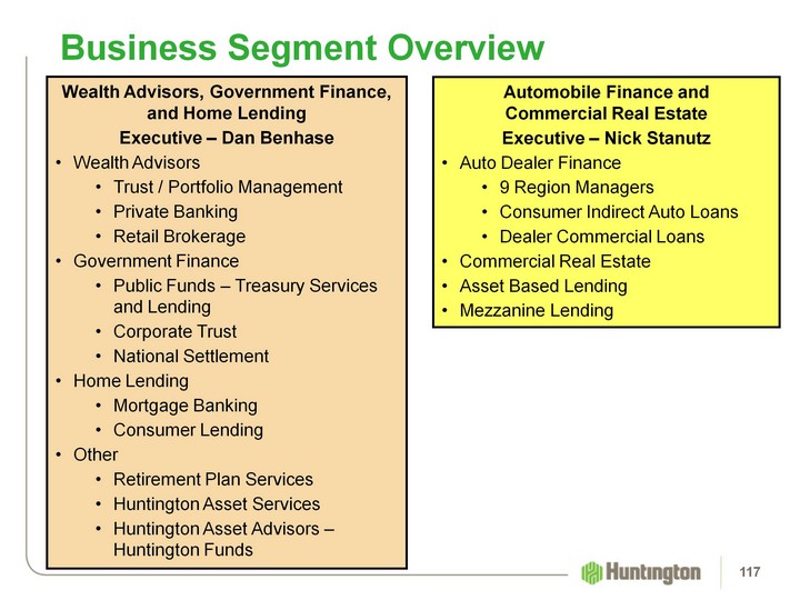 | Business Segment Overview Wealth Advisors, Government Finance, and Home Lending Executive - Dan BenhaseWealth AdvisorsTrust / Portfolio ManagementPrivate BankingRetail BrokerageGovernment FinancePublic Funds - Treasury Services and LendingCorporate TrustNational SettlementHome LendingMortgage BankingConsumer LendingOtherRetirement Plan ServicesHuntington Asset ServicesHuntington Asset Advisors - Huntington Funds Automobile Finance and Commercial Real Estate Executive - Nick StanutzAuto Dealer Finance9 Region ManagersConsumer Indirect Auto Loans Dealer Commercial LoansCommercial Real EstateAsset Based LendingMezzanine Lending 117 |