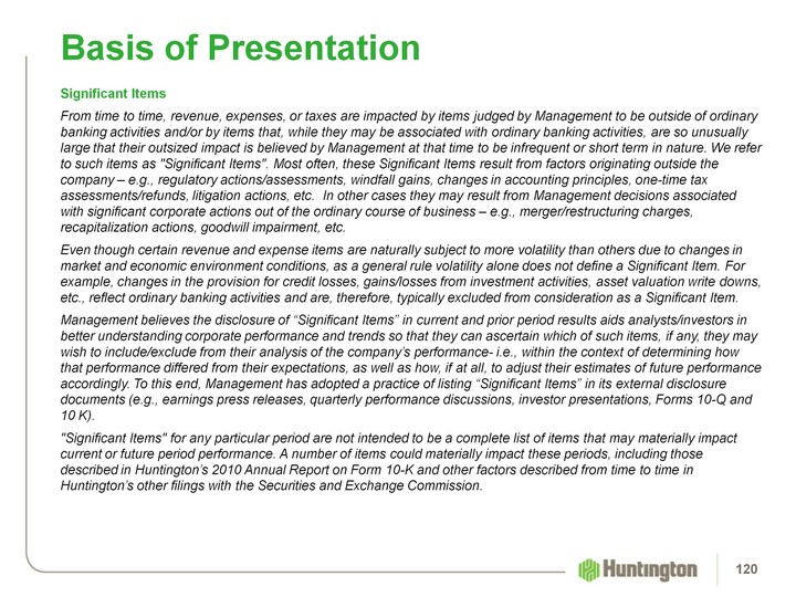 | Significant ItemsFrom time to time, revenue, expenses, or taxes are impacted by items judged by Management to be outside of ordinary banking activities and/or by items that, while they may be associated with ordinary banking activities, are so unusually large that their outsized impact is believed by Management at that time to be infrequent or short term in nature. We refer to such items as "Significant Items". Most often, these Significant Items result from factors originating outside the company - e.g., regulatory actions/assessments, windfall gains, changes in accounting principles, one-time tax assessments/refunds, litigation actions, etc. In other cases they may result from Management decisions associated with significant corporate actions out of the ordinary course of business - e.g., merger/restructuring charges, recapitalization actions, goodwill impairment, etc. Even though certain revenue and expense items are naturally subject to more volatility than others due to changes in market and economic environment conditions, as a general rule volatility alone does not define a Significant Item. For example, changes in the provision for credit losses, gains/losses from investment activities, asset valuation write downs, etc., reflect ordinary banking activities and are, therefore, typically excluded from consideration as a Significant Item.Management believes the disclosure of "Significant Items" in current and prior period results aids analysts/investors in better understanding corporate performance and trends so that they can ascertain which of such items, if any, they may wish to include/exclude from their analysis of the company's performance- i.e., within the context of determining how that performance differed from their expectations, as well as how, if at all, to adjust their estimates of future performance accordingly. To this end, Management has adopted a practice of listing "Significant Items" in its external disclosure documents (e.g., earnings press releases, quarterly performance discussions, investor presentations, Forms 10-Q and 10 K)."Significant Items" for any particular period are not intended to be a complete list of items that may materially impact current or future period performance. A number of items could materially impact these periods, including those described in Huntington's 2010 Annual Report on Form 10-K and other factors described from time to time in Huntington's other filings with the Securities and Exchange Commission. Basis of Presentation 120 |