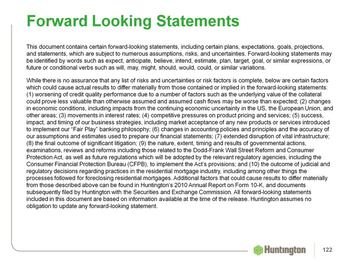 | This document contains certain forward-looking statements, including certain plans, expectations, goals, projections, and statements, which are subject to numerous assumptions, risks, and uncertainties. Forward-looking statements may be identified by words such as expect, anticipate, believe, intend, estimate, plan, target, goal, or similar expressions, or future or conditional verbs such as will, may, might, should, would, could, or similar variations.While there is no assurance that any list of risks and uncertainties or risk factors is complete, below are certain factors which could cause actual results to differ materially from those contained or implied in the forward-looking statements: (1) worsening of credit quality performance due to a number of factors such as the underlying value of the collateral could prove less valuable than otherwise assumed and assumed cash flows may be worse than expected; (2) changes in economic conditions, including impacts from the continuing economic uncertainty in the US, the European Union, and other areas; (3) movements in interest rates; (4) competitive pressures on product pricing and services; (5) success, impact, and timing of our business strategies, including market acceptance of any new products or services introduced to implement our "Fair Play" banking philosophy; (6) changes in accounting policies and principles and the accuracy of our assumptions and estimates used to prepare our financial statements; (7) extended disruption of vital infrastructure; (8) the final outcome of significant litigation; (9) the nature, extent, timing and results of governmental actions, examinations, reviews and reforms including those related to the Dodd-Frank Wall Street Reform and Consumer Protection Act, as well as future regulations which will be adopted by the relevant regulatory agencies, including the Consumer Financial Protection Bureau (CFPB), to implement the Act's provisions; and (10) the outcome of judicial and regulatory decisions regarding practices in the residential mortgage industry, including among other things the processes followed for foreclosing residential mortgages. Additional factors that could cause results to differ materially from those described above can be found in Huntington's 2010 Annual Report on Form 10-K, and documents subsequently filed by Huntington with the Securities and Exchange Commission. All forward-looking statements included in this document are based on information available at the time of the release. Huntington assumes no obligation to update any forward-looking statement. Forward Looking Statements 122 |